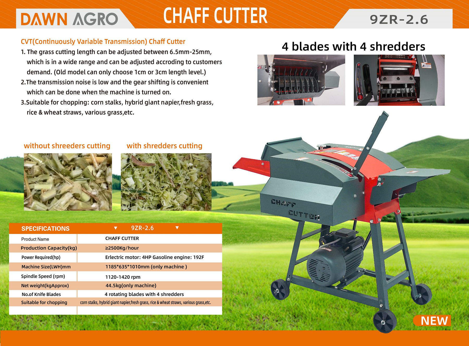 Suitable for chopping: corn stalks, hybrid giant napier,fresh grass, rice & wheat straws, various grass,etc.
